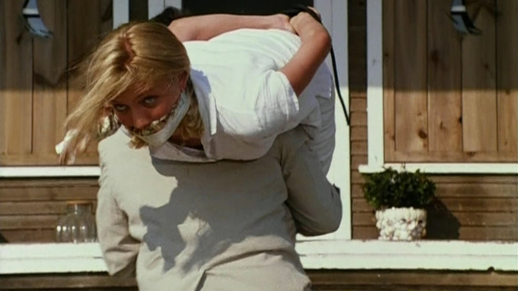 A mystery film shot of a girl tied up in white shirt and jeans, and a soap still of a gagged Sarah Jane from Coronation Street
